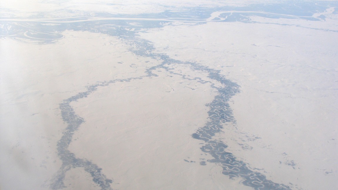 Flight from Bethel to Anchorage. The painfully squiggly Fog River (left) and Tuluksak River (right) join together and run into the Kuskokwim River at Tuluksak.