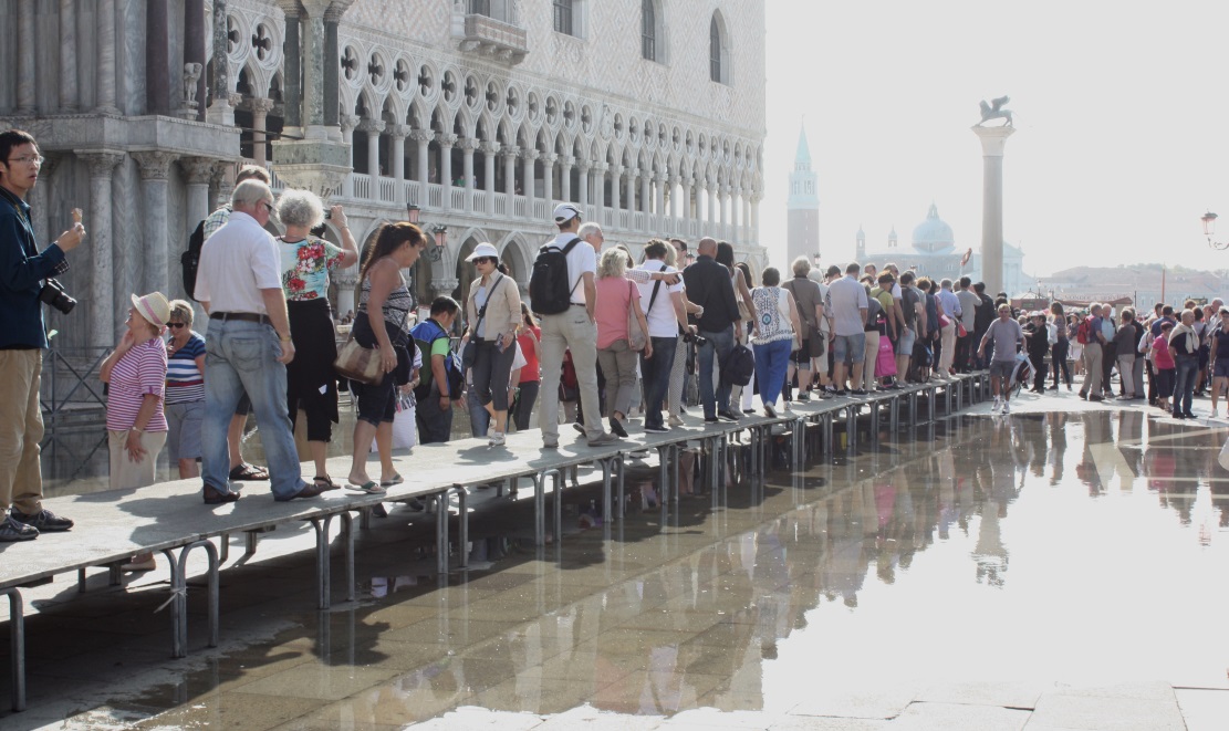 Waiting to get into St Mark's Campanile involves standing on the raised platforms to keep one's feet dry.